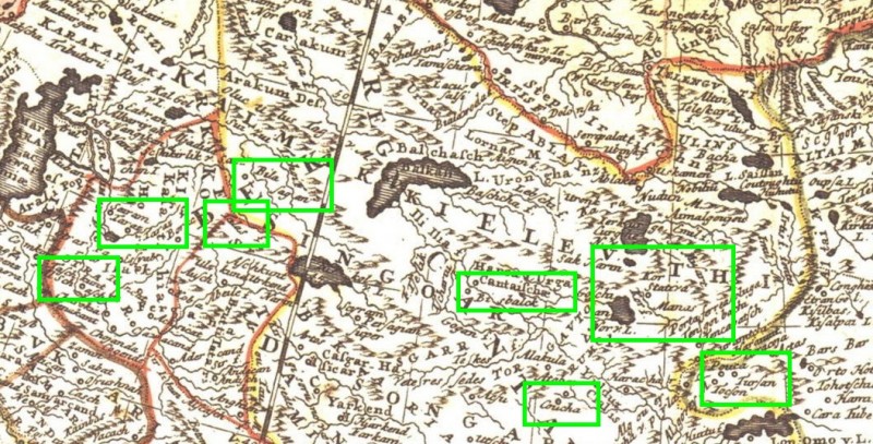 из этого перечня часть названий уходит в район ЗИМОВОК (очевидно не все КЕРАИТЫ там могли зимовать) = район ИЛИ и ТАЛАСА; часть - в район ХАНСКОЙ СТАВКИ (истоки ИРТЫША), БУИР-НАУР = см. выше БАР-КУЛЬ, БУРКАН-КАЛДУН = ДЖУНГАРСКАЯ РАВНИНА (см. статья МОГИЛА ЧИНГИСХАНА). часть - ЛЕВОЕ КРЫЛО, например, СЕЛЕНГА... в общем, вписывается в концепцию, ее истоки примерно соответствуют северо-восточному МОГУЛИСТАНУ, однако есть основания полагать, что в переводе уравняли два "похожих" названия: СЕЛЕНГА и СЕНКИ-БАЙ (а это уже район ТАЛАСА).