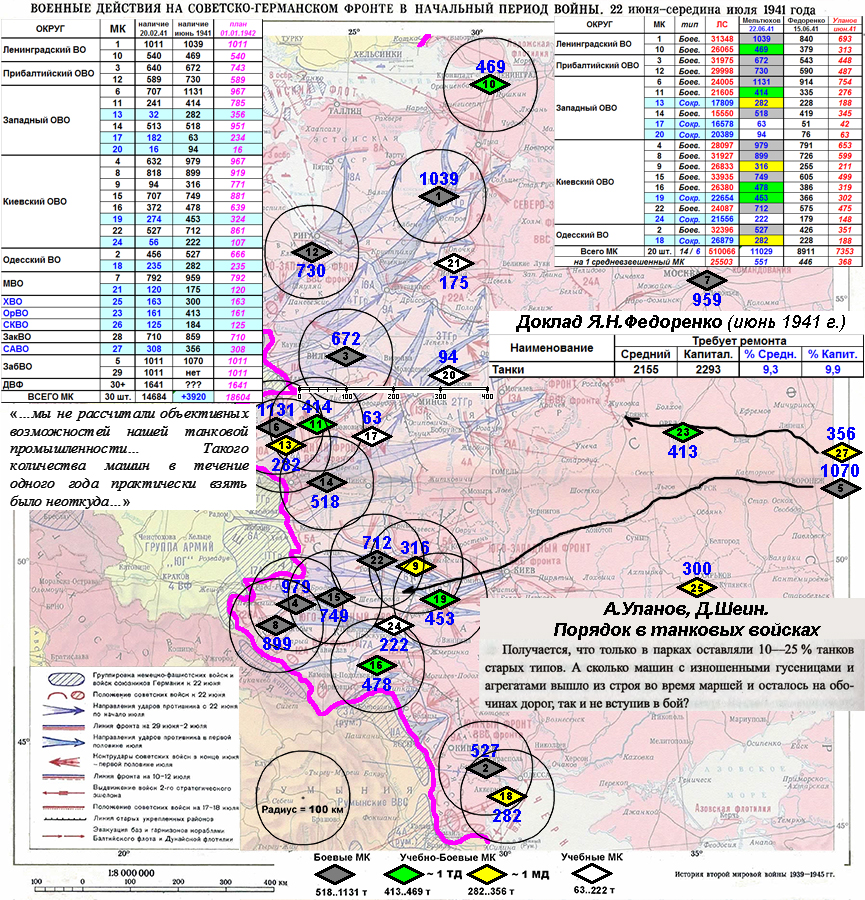 Чисто, в качестве иллюстрации. Термины "Учебно-боевые" и "Учебные" МК - авторский произвол. Суть, которого в том, что из состава Учебно-Боевых МК можно было организовать либо ОДНУ танковую (зеленые ромбики) в составе 375 танков, либо ОДНУ моторизованную (желтые ромбики) в составе 275 танков, дивизию. Из белых ромбиков (Учебных МК) выделить было можно только пехоту... Как пишут, зачастую без винтовок. Разумеется, темно-серые ромбики тоже, не айс, большая часть это ДВЕ дивизии, но не полный МК.