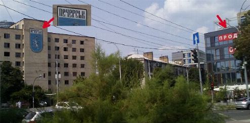 Правее на торцевой стороне дома виднеется эмблема Печерского района: