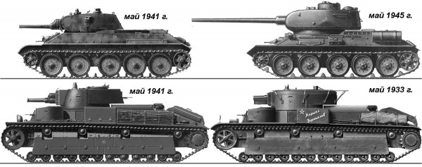 Только, вот "бЯда", в июне 1941 Т-34 мог похвастаться только 45 мм броней и пушкой Л-11 или Ф-32, а Т-28Э имел ствол Л-10 и броню 30..50 мм. Это левая пара на рисунке. Все, конечно, правильно, Т-34/76 "переигрывал" и в это время и по броне, и по стволу... но уже не так и существенно (типа, "по очкам"). Кроме того, по удобству (т.е. эффективности) применения этих преимуществ отставал очень существенно (двухместная башня и отсутствие раций на большинстве Т-34).