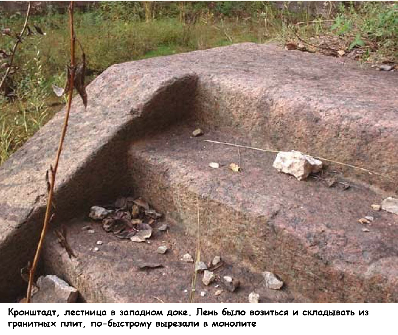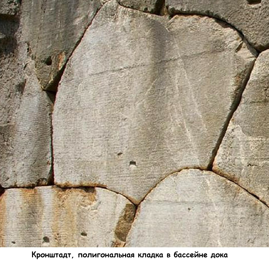 Инженеры утверждают, что современные технологии не в состоянии дотянуться до уровня работы с камнем древних ваятелей. А может это некая иная цивилизация всё это понастроила? А мы только пользуемся остатками? Не зря же Петр систематически уничтожал все старые записи о тех местах, на которых построили город? Чтобы стать великим, надо уничтожить память о прошлом, но присвоить себе его деяния. Что Петр и проделал, приписав своей монаршей воле создание города наперекор всякому здравому смыслу. А вот полигональные кладки Кольского полуострова – им около 9 тысяч лет. Кто тут жил раньше? При постройке фортов Кронштадта и облицовке набережных использовано огромное количество гранитных блоков идеальной формы. Около 10 фортов в Финском заливе облицованы 2-х тонными гранитными блоками, уложенными без раствора. При такой кладке чистота обработки поверхности должна быть высокой – как у керамической плитки, и перпендикулярность граней выдержана должна быть идеально. Изготовить такие блоки вручную очень трудоемко – необходимо долгое шлифование плоскостей. Стандартное и точное производство в таких условиях просто невозможно. А при машинном конвейерном производстве это получается само собой. А вот стенка Кронштадского дока – типичная полигональная кладка. Это означает, что при строительстве использовали уже готовый материал, разбирая старые сооружения, либо тогдашним мастерам обработка гранита была детской игрой – как хотели, так и резали. Про вес блоков вообще помолчим – все сплошь Ильи Муромцы, одной рукой горы двигали. Вот лестница в западном доке: десяток ступенек вырезаны из одной гранитной глыбы. Зачем такой труд и в таком месте? Что, нельзя было просто из плит эту лестницу сложить? Но тогдашним мастерам это казалось более простым способом, чем возиться складывать и ровнять. Взяли и в многотонной глыбе вырезали ступеньки. Раз плюнуть. А энтузиасты волосы на себе рвут, вопя о тайнах египетских пирамид. А то, что тоже самое произошло у них под носом в России, и внимания не обращают. Главное, куда все знания подевались? Удивляет и то, что гранитные сооружения имеются только в Кронштадте и Петербурге, всё остальное – кирпичное.
