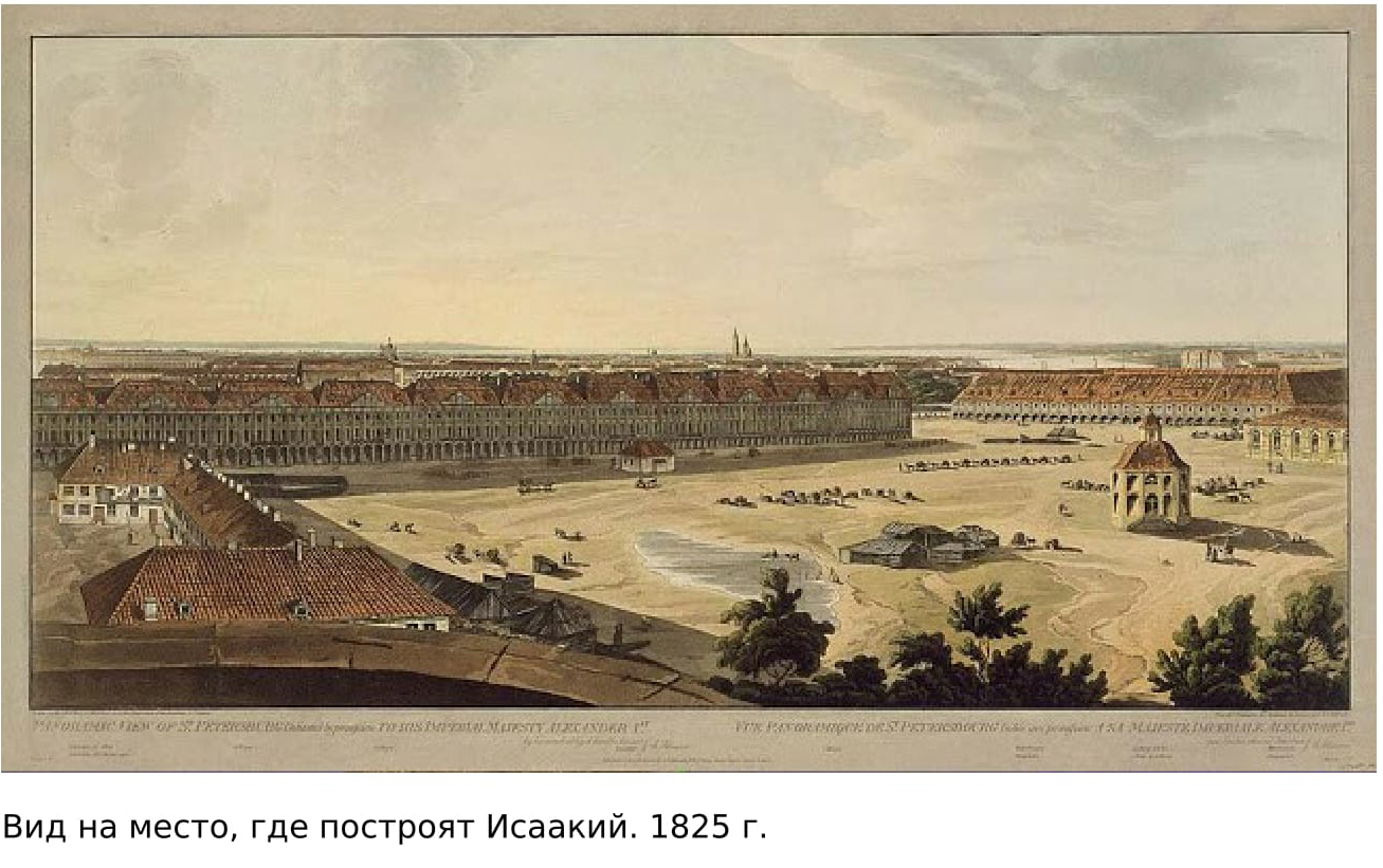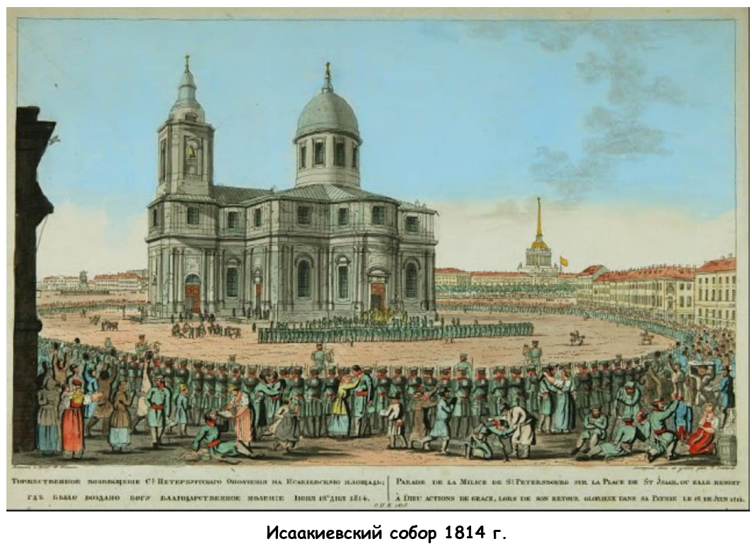 Всё логично и увязано в единый последовательный процесс. НО! Вот картина И.А. Иванова: «Торжественное возвращение Санкт-Петербургского ополчения на Исаакиевскую площадь», 1815 год. А вот картина А. Брюллова, напечатанная в газете. Прочитайте внимательно подпись: собор по проекту Ринальди, строительство окончено в 1802 году. А официально первая колонна была установлена 20 марта 1828 года. А вот картина неизвестного художника: вид на Адмиралтейство и старый Исаакиевский собор. 1825 год. А вот литография до 1830 года – Исаакиевский собор, достроенный В. Бренна по проекту Ринальди.