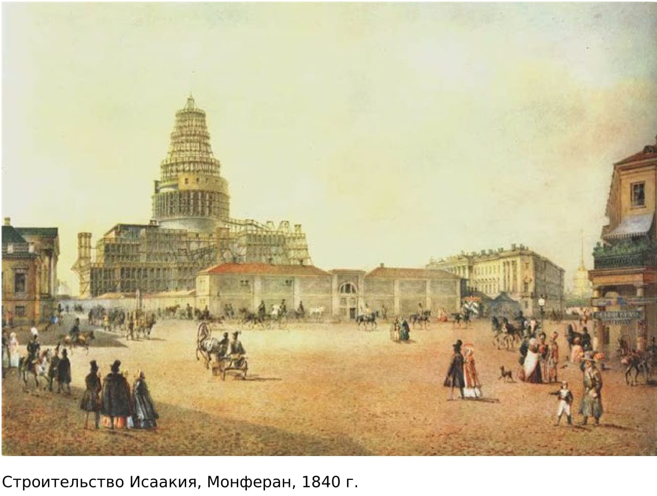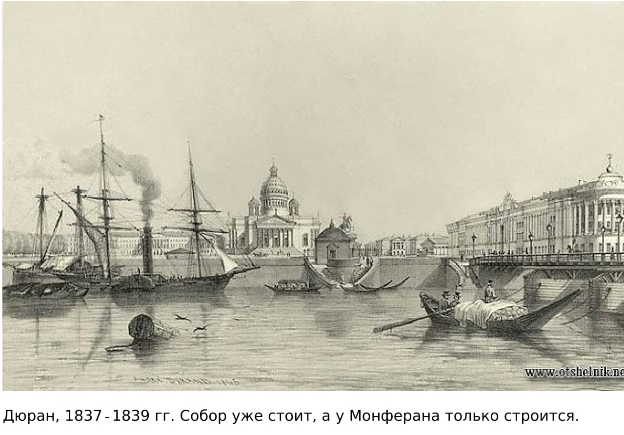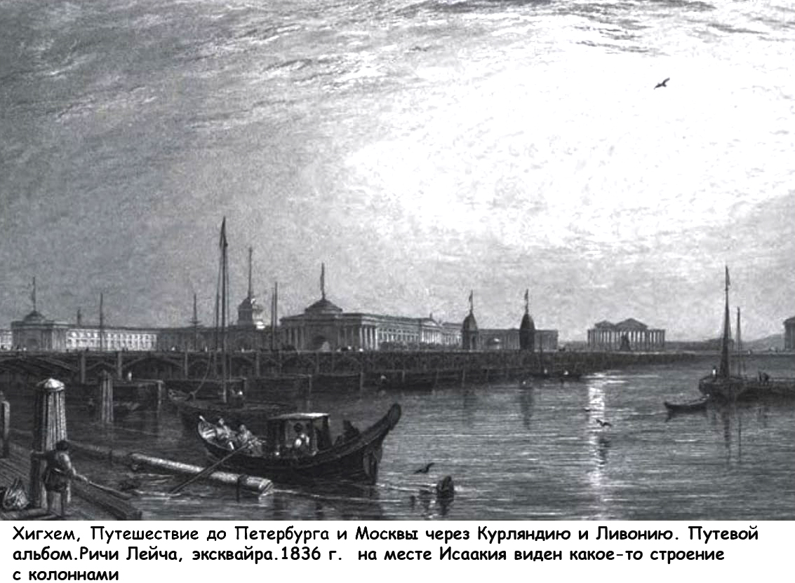 Вот литография постройки Исаакия О. Монферана. 1840 год четырех угловых куполов-башен нет и в помине. А вот литография Дюрана 1939 года – стоит собор как миленький А вот иллюстрация Хигхема из книги сэра Ричи Лейча эсквайра о его путешествии в Петербург и Москву 1835-36 год. Внимательно вглядитесь – что там на месте Исаакия? Как всё это утрясти в цельную картину? Кто врет?