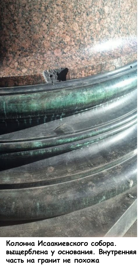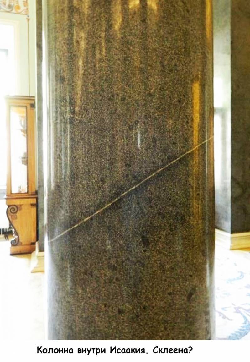 Но дело не только в этом. Есть версия, что и Александровская колонна и колонные Исаакия не вырезаны из одного блока гранита, а составлены из нескольких блоков и покрыты искусственным гранитом. Монферан об этом не знал. На Александрийской и исаакивских колоннах видны заплатки. По какой причине их делали? А вот одну щербину недосмотрели – полюбуйтесь. Там внутри что, гранит? Непохоже. Для сравнения поглядите на сколовшийся край гранитной ступеньки на фото выше. А вот фотография колонны внутри Исаакия – склеили колонну-то. Кстати, и сегодня сделать идеально круглую колонну такого размера из одного куска гранита – задача очень сложная. А в то время все делали вручную, на глазок, кувалдой и такой-то матерью. А вот если предположить, что искусственный гранит заливали в опалубку, а потом шлифовали и полировали – тогда задача упрощается.