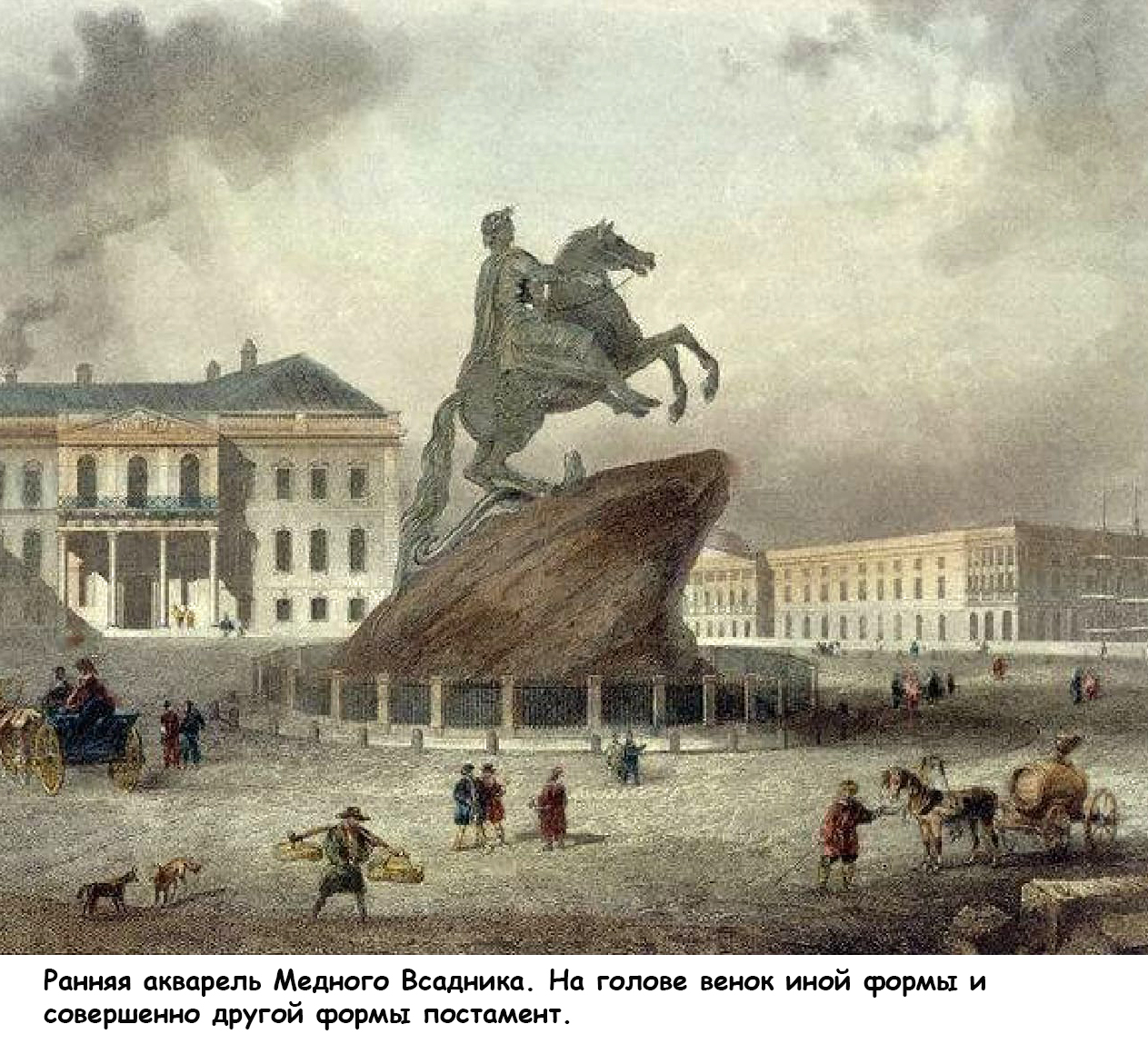 Вдогонку к сказанному выше: вот настоящий Петр и вот ранняя акварель Медного всадника: венок на голове иной формы и совсем непривычный пъедестал.