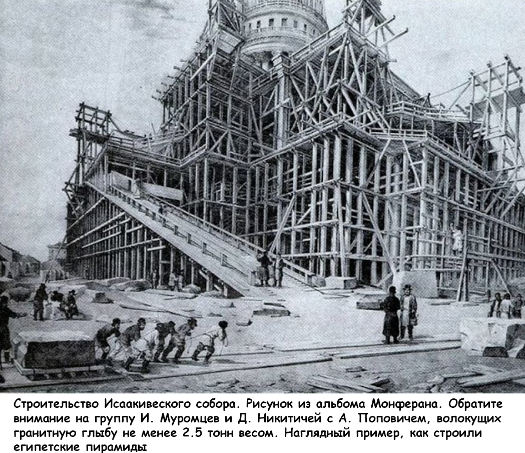 Вообще с Исаакием много вопросов. Вот картинка с обложки журнала «Иллюстрация» 1848 года. Вглядитесь в силуэт собора. Это что, художник воспарил воображением, или рисовал с натуры? А вот рисунок Монферана – строительство собора. Обратите внимание на группу мужиков слева внизу. Любители пощипать себе нерву всякими тайнами голосят о неведомых способах транспортировки 2,5 тонных блоков на строительство пирамид в Египте. Или, там в Южной Америке. Вот вам пример, как это делалось. Кстати, если знаете арифметику, посчитайте, сколько мужиков волокут 2,5-3 тонный гранитный блок? И каким способом они это делают? Что, древние египтяне так не могли? Ума не хватало? А если ещё учесть, что официальная история растянула реальную египетскую историю в 3-4 раза, то и разрыв по времени между обоими строительствами оказывается не так уж и велик.