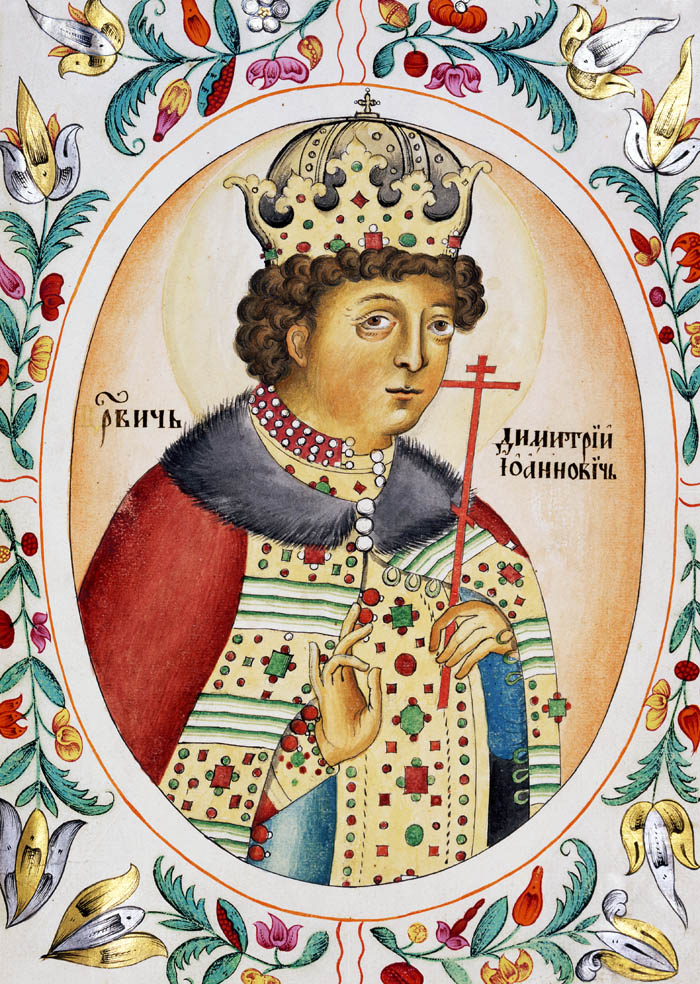 Уважаемый Д_буличев изображение царевича Дмитрия в Титулярнике появилось через 81 год после его смерти и через 66 лет после "обретения нетленных мощей", обстановка в России 1600-1614 годов была такой, ТРИ только официальных ЛЖЕДМИТРИЯ, на самом деле было в два раза больше, тут уж не до портретов. Федор Иоаннович сын Иоанна Васильевича Грозного не удосужился написать с брата прижизненный портрет-парсуну, у него самого проблем было выше его крыши - постник и молчальник, более пригодный для кельи, чем к царствованию. У Федора умерла дочь в 1594 году, а сам он умер 7(17) января 1598 года.