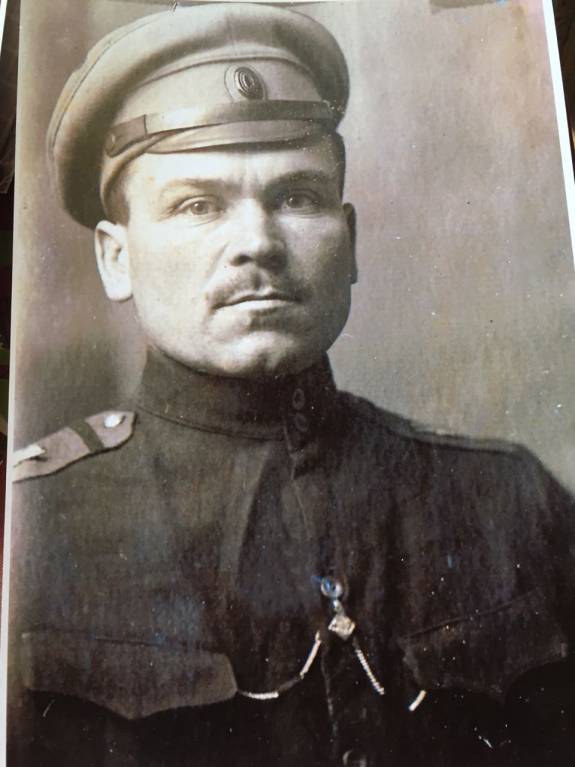 Исходя из знаков различия - одна лычка - это ефрейтор, цвет погона определял род войск. На погоне до Первой Мировой был Царский вензель, в данном случае это полевая форма. В Гражданскую войну буква могла уже обозначать например Дроздовцев. Правда у Дроздовцев рубаха была белой.