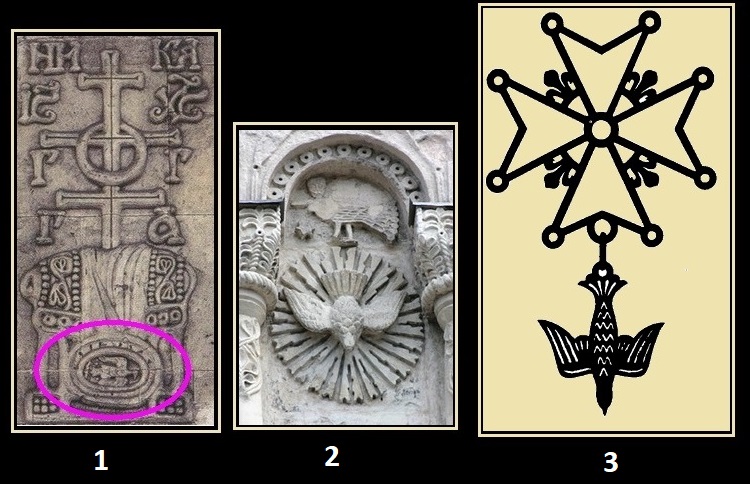 Встретился странный для христианства символ - мёртвая птица. Обычно на вопросы об изображениях 2 и 3 отвечают, что это - голубь - символ Святого Духа, и что он вовсе не мёртвый, но изображение 1 бесспорно показывает мёртвую птицу, лежащую в могиле под крестом - там, где обычно изображают череп и кости - то ли попранную смерть, то ли могилу "ветхого человека" Адама.