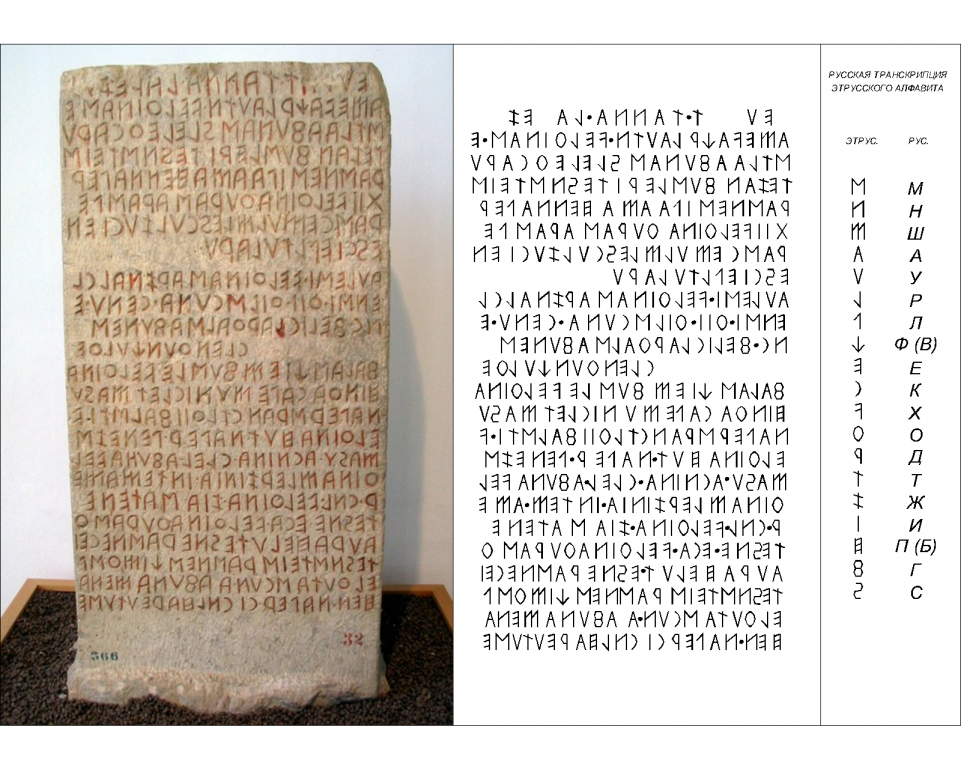 1. То, с чем мы сейчас сталкиваемся (различные этрусские тексты) – это уже не есть единый язык этрусков, а группа родственных языков, которые разошлись во времени и пространстве на порой отдаленные диалекты. Спасательным кругом этрусского самосознания для этих родственных, но явно различных языков являлось ПИСЬМО.