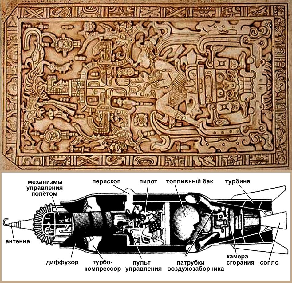 Эрик фон Дэникен сенсационно преподнес плиту надгробия индейского вождя, расшифровав барельеф плиты в Пакале, как индейца, сидящего за управлением летательного аппарата. Специалисты из космонавтики добавили для наглядности, сопоставление с управляемой ракетой. Если взять во внимание психологию древнего человека любой национальности, отметим, что к искажению фактов, обману, а тем более к фантазии в те времена, гомосапиенс мозгами своими еще не дорос. Мошеннический прогресс на подсознание социума на много столетий впереди. А пока вместо будущих сказок - быль. Что глазами виделось, то устами передавалось. Вера в Богов была искренняя.
