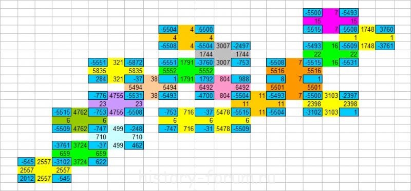 А все наши корреляции отлично ложатся вот в такую сеть "кирпичиков". Синим - дата начала эры, а разными цветами - синхронная разница лет между соседними парами. Как видите, хронология Мира неразрывно связана.