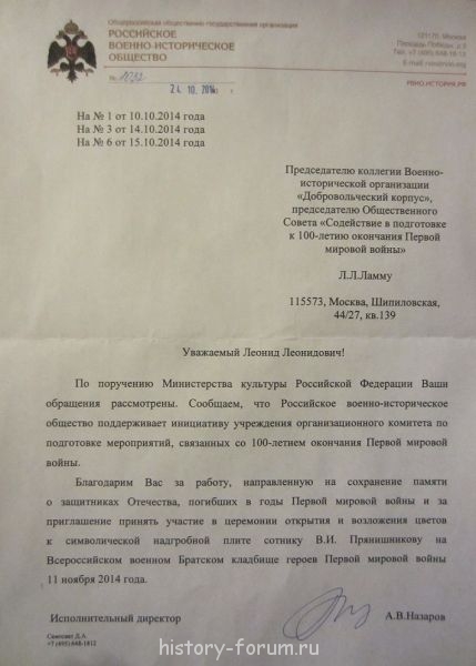 Предложение "Добровольческого корпуса" и Общественного Совета поддержано Общероссийской общественно-государственной организацией "Российское военно-историческое общество", о чем сообщает его Исполнительный директор А.В. Назаров в документе № 1032 от 24.10.2014: