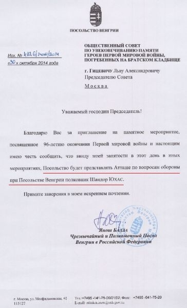 Благодарю Вас за приглашение на памятное мероприятие, посвященное 96-летию окончания Первой мировой войны и настоящим имею честь сообщить, что ввиду моей занятости в этот день в иных мероприятиях, Посольство будет представлять Атташе по вопросам обороны при Посольстве Венгрии полковник Шандор ЮХАС.