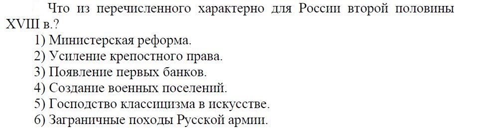 По второму вопросу: что характерно для России второй половины XVIII века? 2. Усиление крепостного права. 3. Появление первых банков. 6.Заграничные походы Русской Армии.