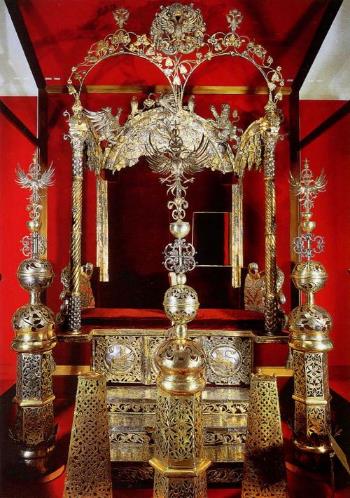На фотографии номер №1 изображен трон сделанный в Оружейной палате Московского Кремля по заказу Боярской Думы для Малолетних Ивана Алексеевича и Петра Алексеевича. Трон был снабжен окошком для царевны Софьи Алексеевны - которая таким образом могла руководить малолетними Царями, ну конечно сама могла поучаствовать и представиться заморским послам.
