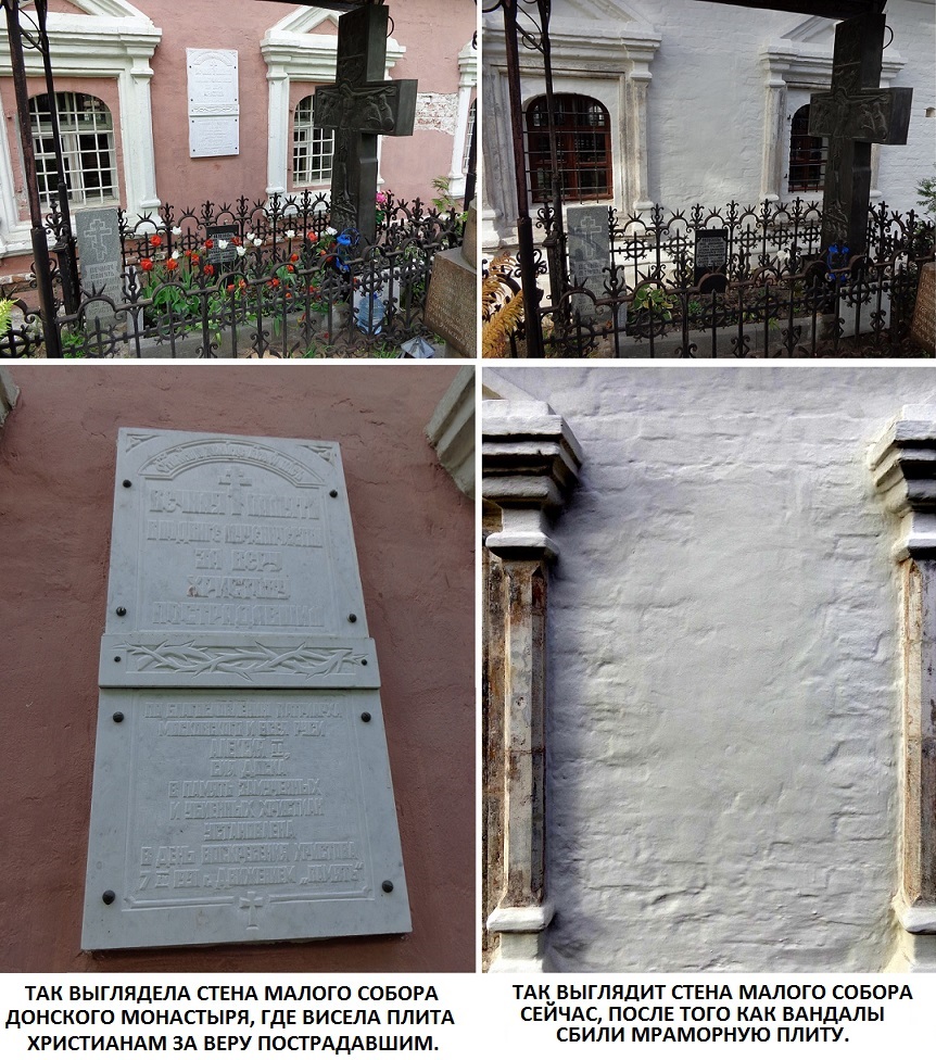 Освященная доска Христианам "В подвиге мученичества за Веру Христову пострадавшим" должна быть восстановлена в прежнем виде на стене Малого Донского Собора, а виновные в ее осквернении должны быть отстранены от занимаемой должности либо публично покаяться в совершенном злодеянии!