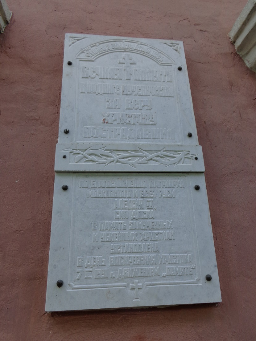 В сентябре 2016 года эта ОСВЯЩЕННАЯ доска была сбита со стены, изуродована и уничтожена под предлогом приведения внешнего облика Малого Собора Донского монастыря в "первоначальный исторический вид".